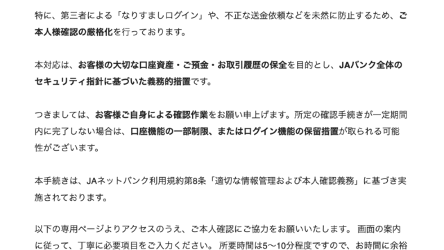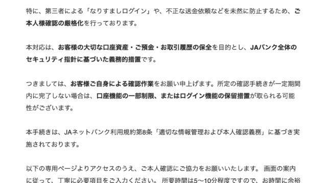 全国信用金庫協会(全国の信用金庫を会員とする業界)を装った詐欺メール(フィッシングメール)です。お客様のアカウントでログイン異常が発生したため、振込(出金)、ATMの利用(出金)が一時的に制限されており、制限解除のために本人確認が必要で、2...