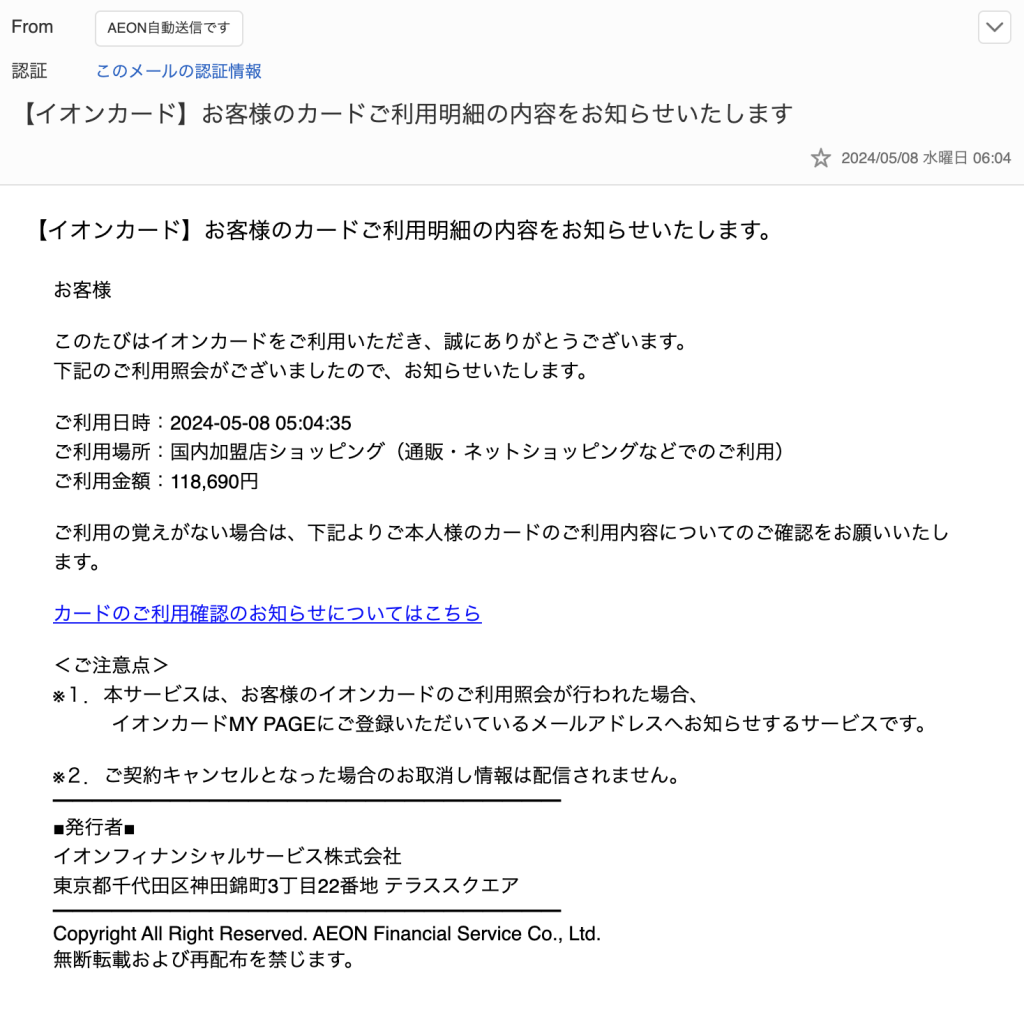 カードのご利用確認のお知らせについてはこちらの部分