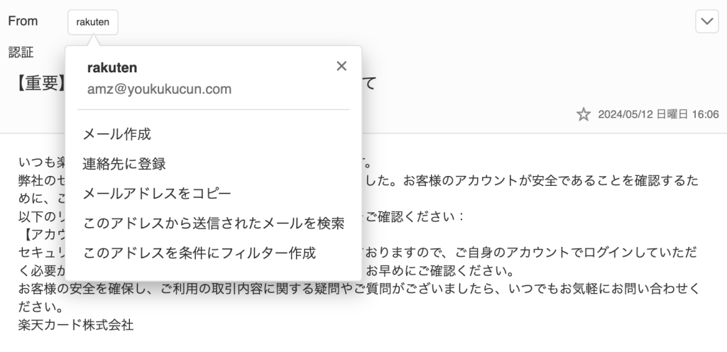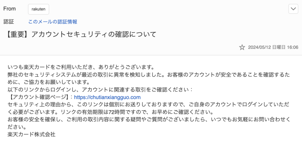 このメールは楽天カードをかたるフィッシングメールです。