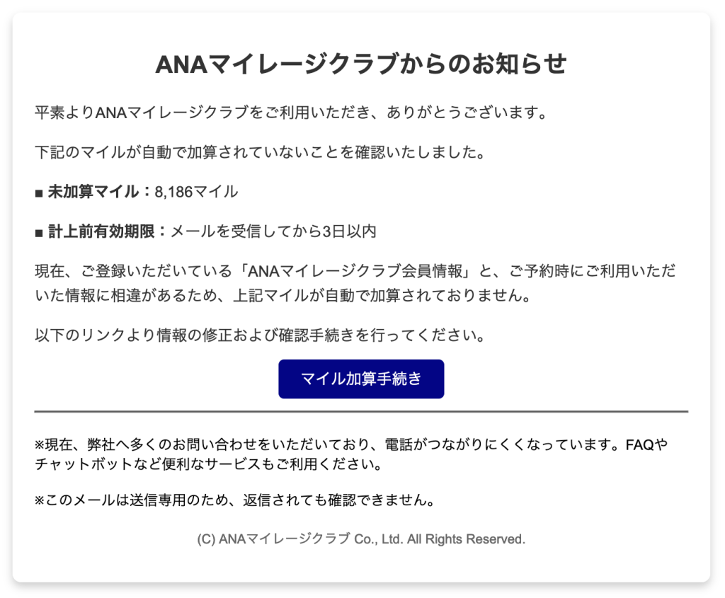 【緊急通知】ANAマイレージクラブ:マイル加算手続きの詳細(メール番号:LG-AY-45337605714)