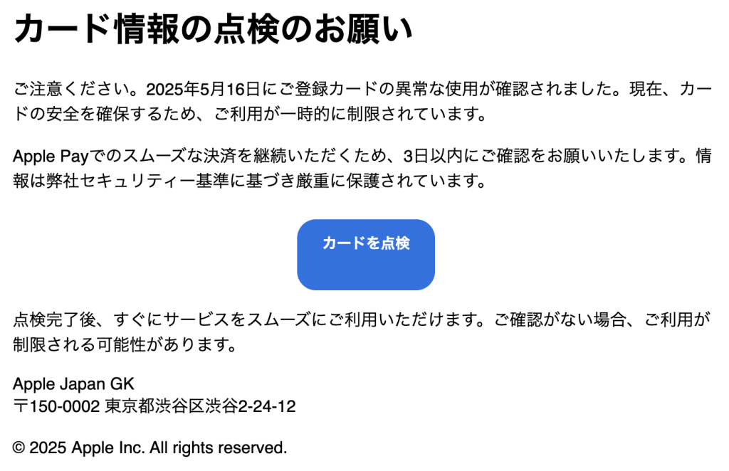 ご注意ください。2025年5月16日にご登録カードの異常な使用が確認されました。現在、カードの安全を確保するため、ご利用が一時的に制限されています。