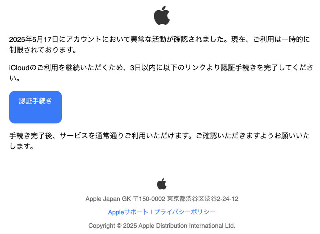 iCloudのご利用を継続いただくため、3日以内に以下のリンクより認証手続きを完了してください。