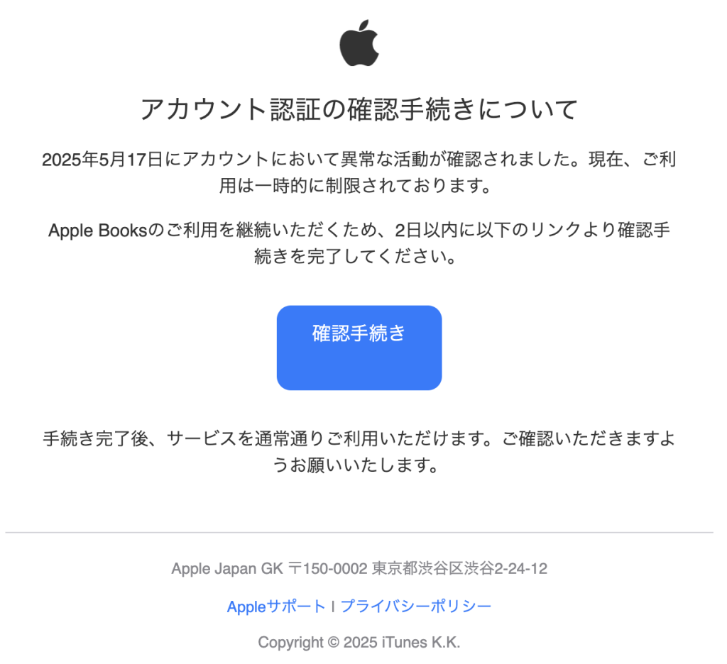 Apple Booksのご利用を継続いただくため、2日以内に以下のリンクより確認手続きを完了してください。