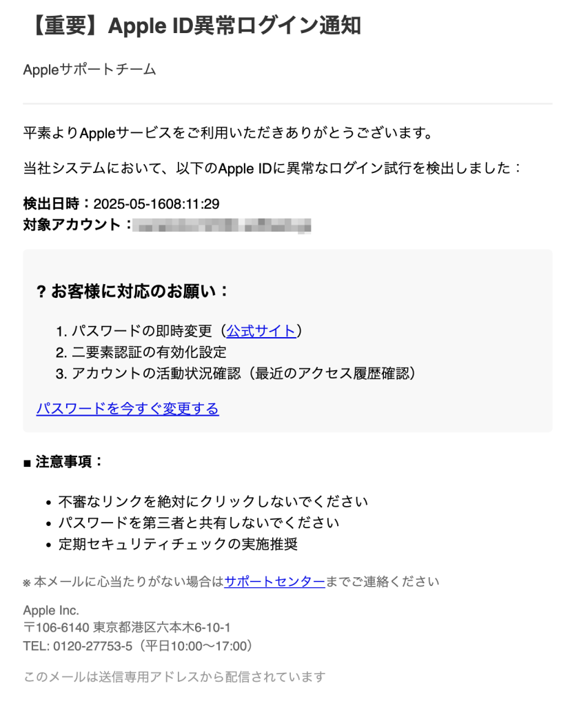 当社システムにおいて、以下のApple IDに異常なログイン試行を検出しました: