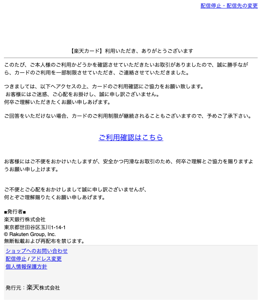 このたび、ご本人様のご利用かどうかを確認させていただきたいお取引がありましたので、誠に勝手ながら、カードのご利用を一部制限させていただき、ご連絡させていただきました。