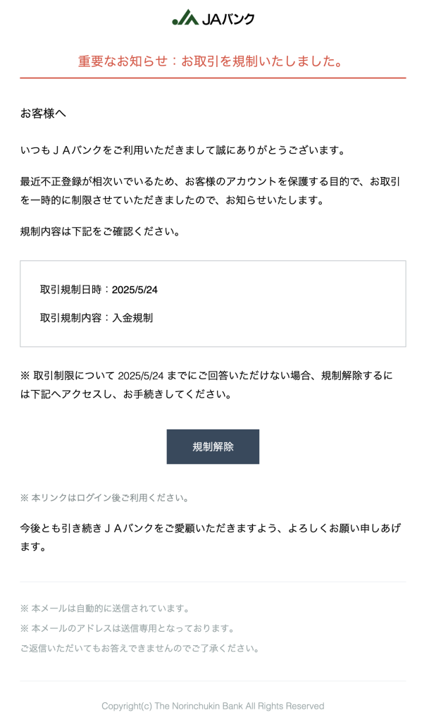 ※ 取引制限について 2025/5/24 までにご回答いただけない場合、規制解除するには下記へアクセスし、お手続きしてください。