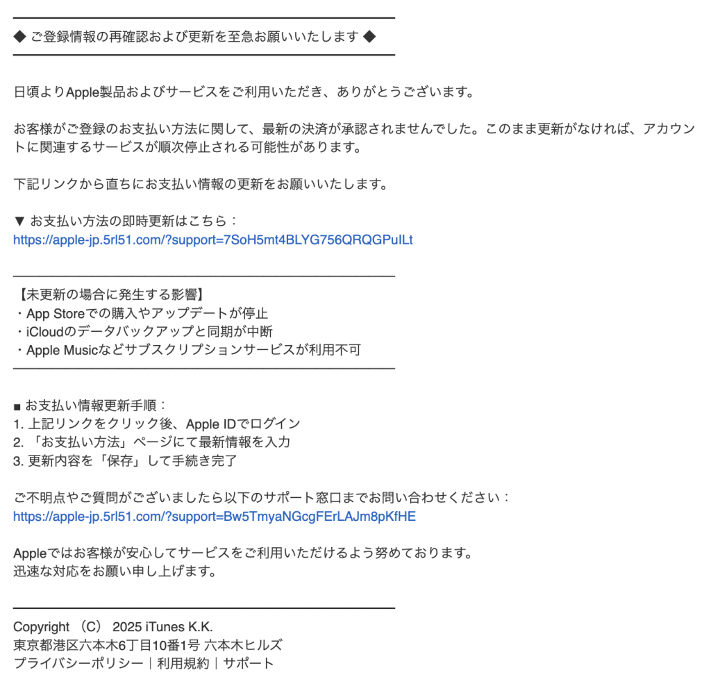 【重要通知】ご登録のお支払い方法が承認されませんでした。至急ご対応をお願いします(2025年5月27日)
