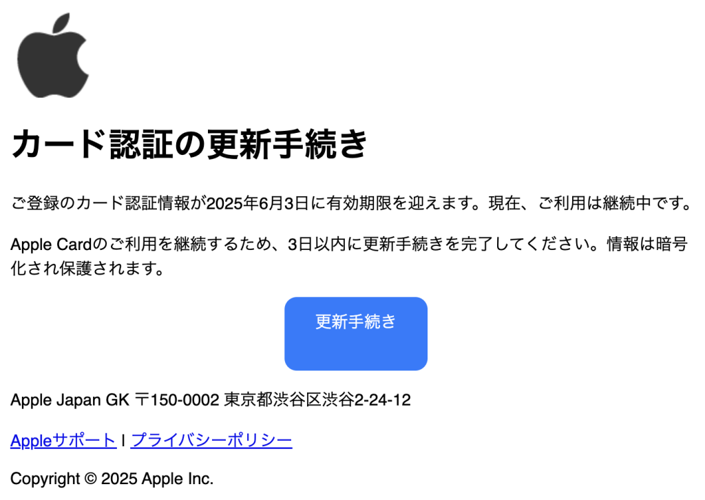 Apple Cardのご利用を継続するため、3日以内に更新手続きを完了してください。情報は暗号化され保護されます。