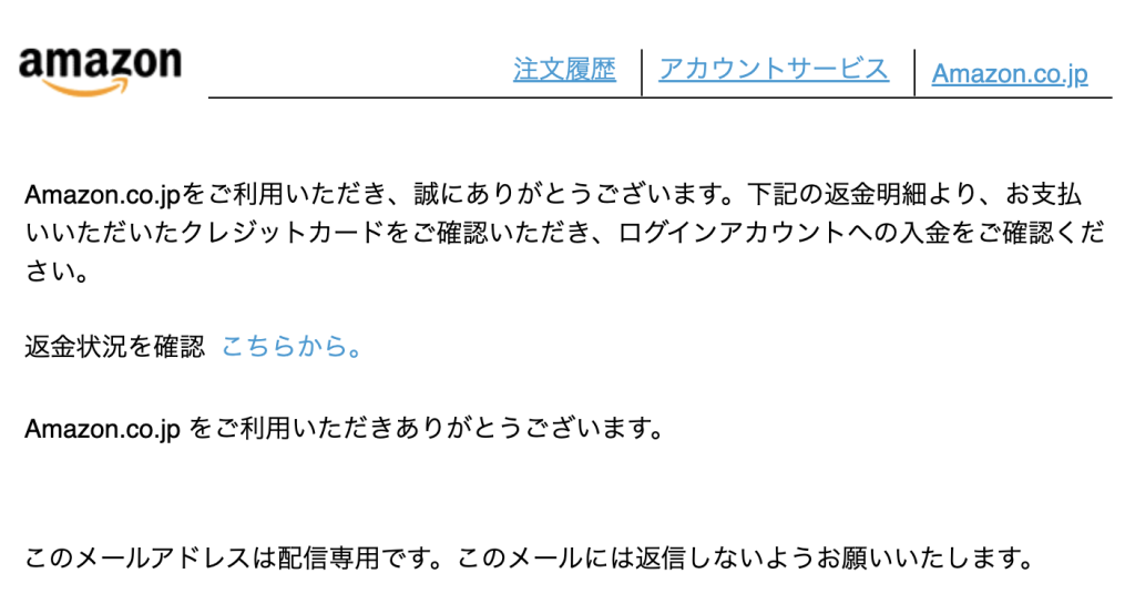 Amazon.co.jpをご利用いただき、誠にありがとうございます。下記の返金明細より、お支払いいただいたクレジットカードをご確認いただき、ログインアカウントへの入金をご確認ください。
