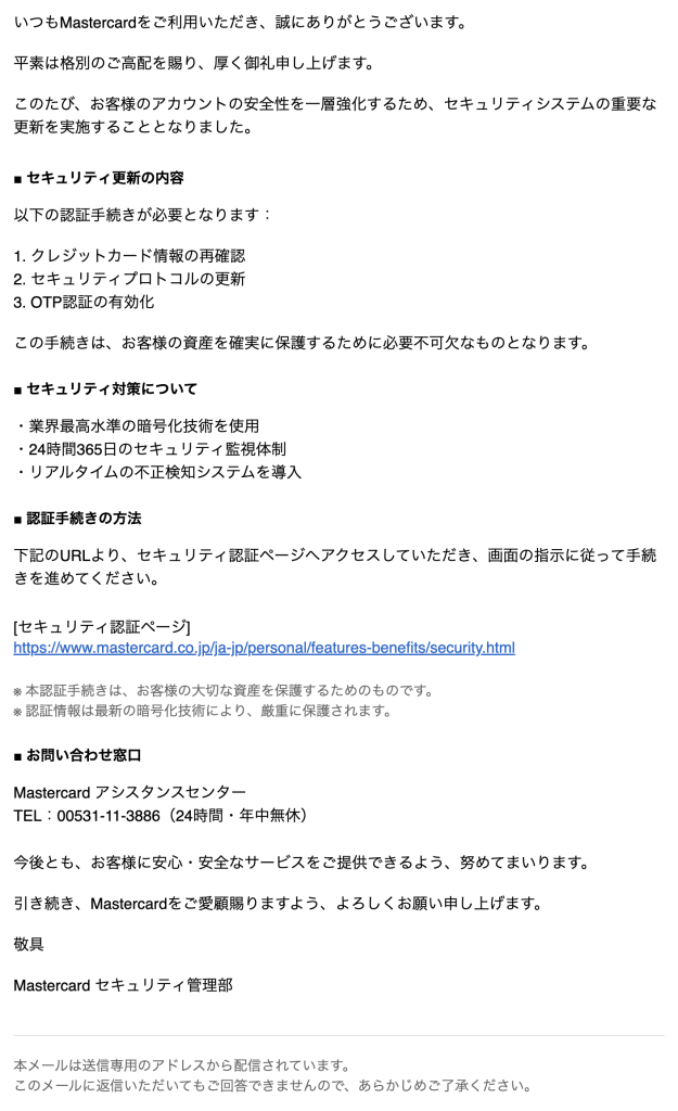 この件名のメールは「マスターカード」を装った詐欺メール(フィッシングメール)です。