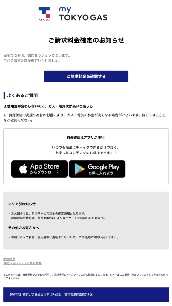 この件名のメールは「東京ガス株式会社」を装った詐欺メール(フィッシングメール)です。