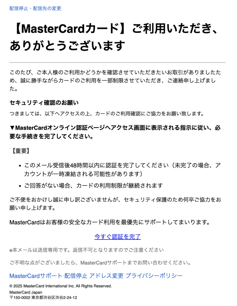 この件名のメールは「マスターカード」を装った詐欺メール(フィッシングメール)です。