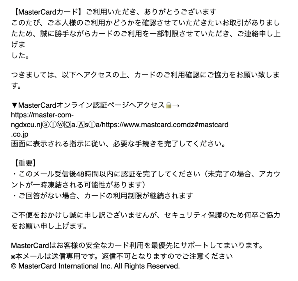 この件名のメールは「マスターカード」を装った詐欺メール(フィッシングメール)です。