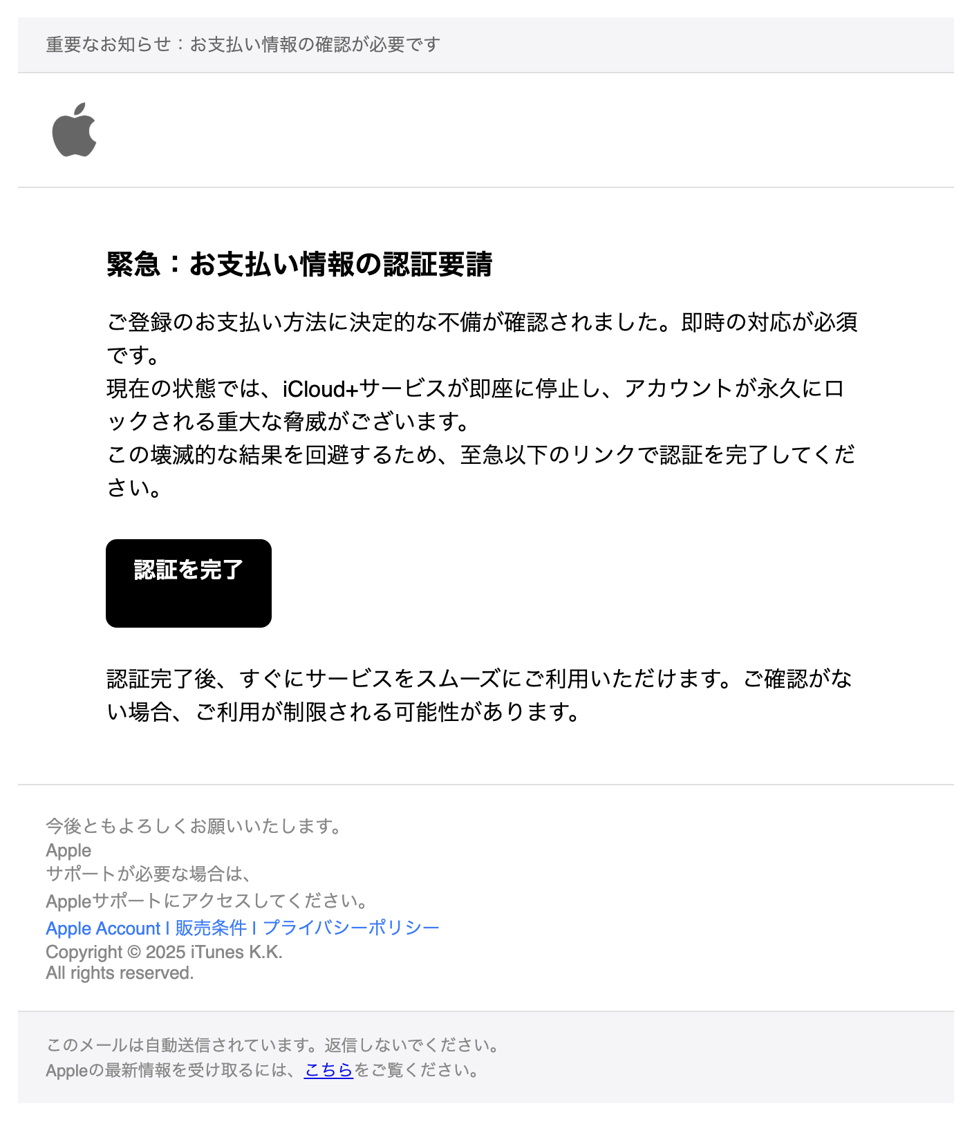 この件名のメールは「Amazon」を装った詐欺メール(フィッシングメール)です。