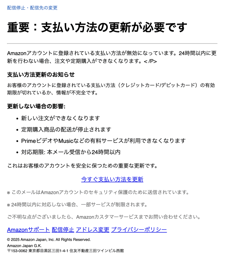 Amazonアカウントに登録されている支払い方法が無効になっています。24時間以内に更新を行わない場合、注文や定期購入ができなくなります。< /P>