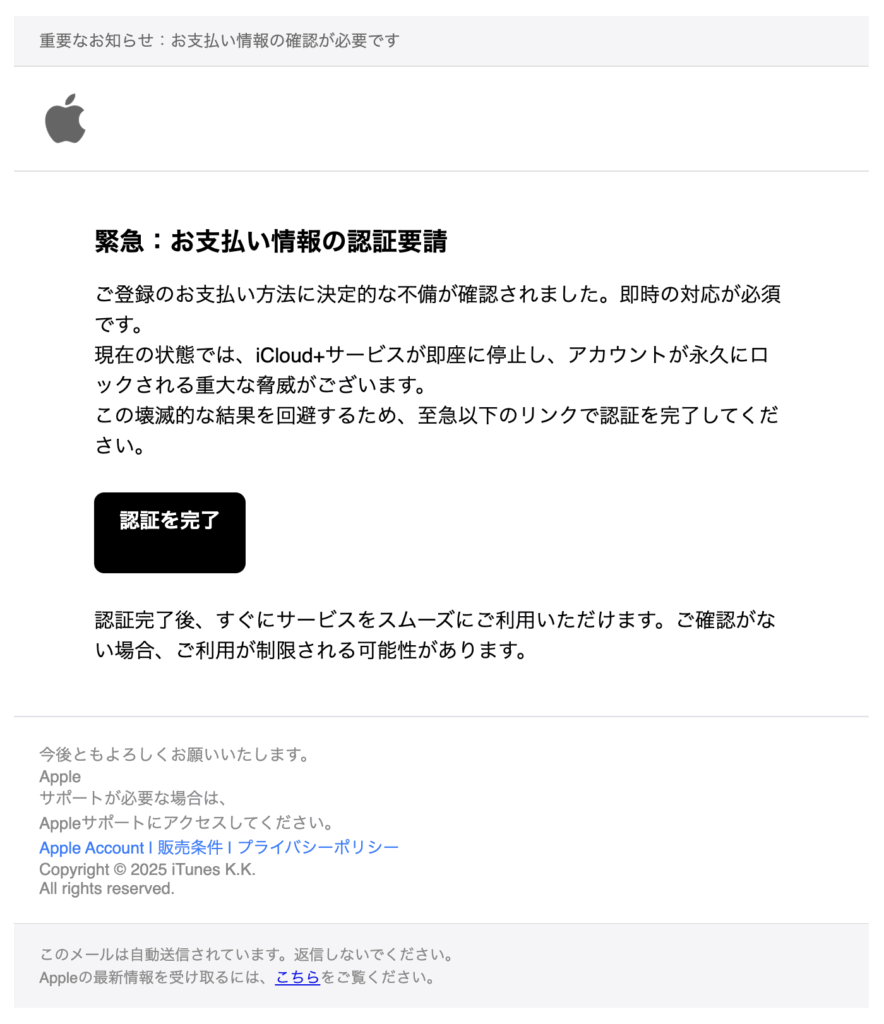 この件名のメールは「Apple」を装った詐欺メール(フィッシングメール)です。