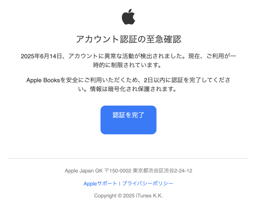 この件名のメールは「Apple」を装った詐欺メール(フィッシングメール)です。