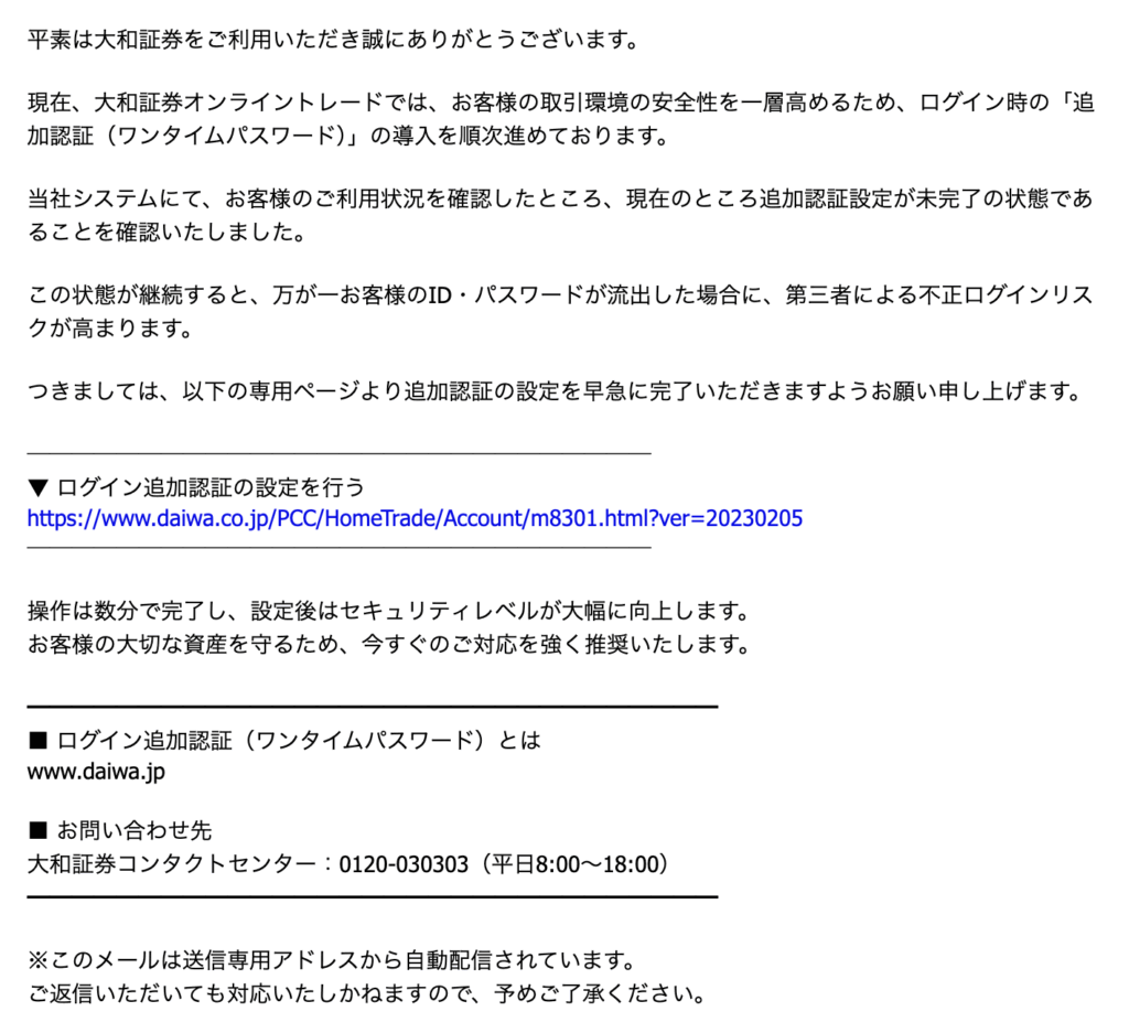 この件名のメールは「大和証券」を装った詐欺メール(フィッシングメール)です。