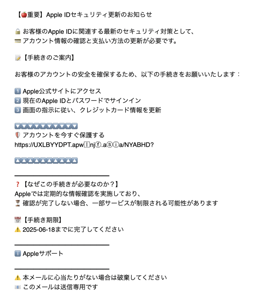 このメールは「Apple」を装った詐欺メール(フィッシングメール)です。