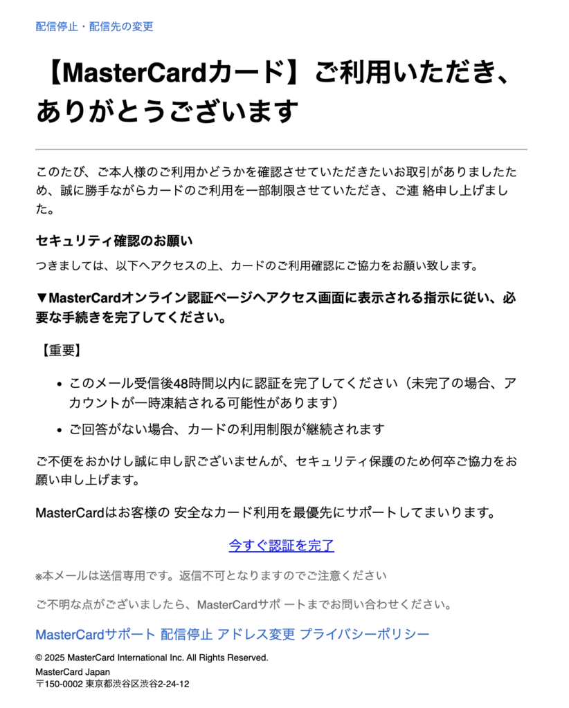 このメールは「マスターカード」を装った詐欺メール(フィッシングメール)です。