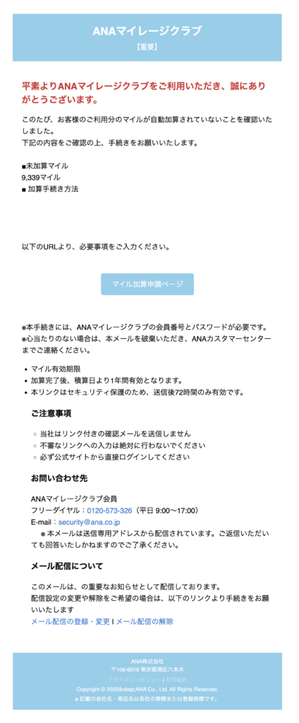 マイルが自動加算されていないことを装い、会員番号とパスワードを抜き取ろうとしています。