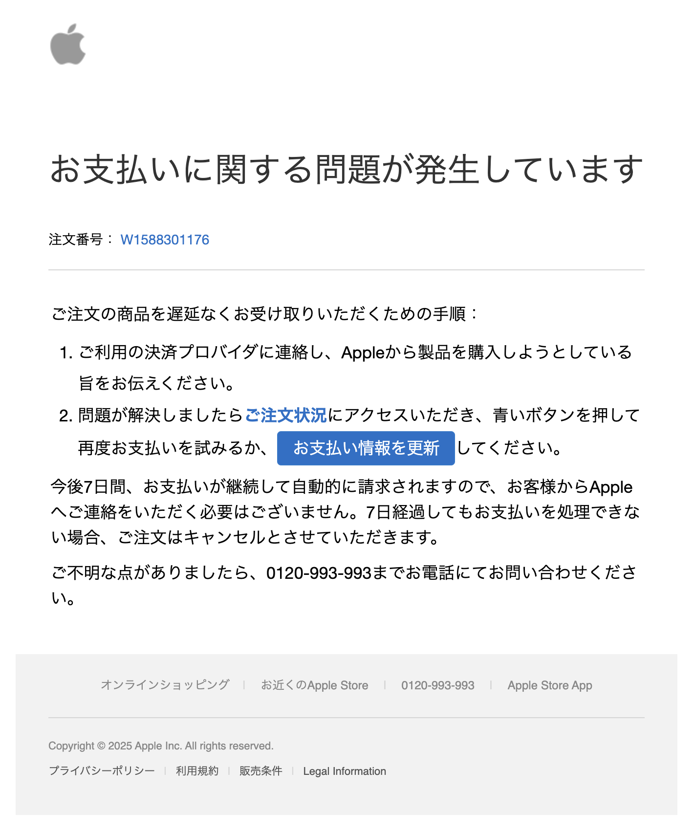 今後7日間、お支払いが継続して自動的に請求されますので、お客様からAppleへご連絡をいただく必要はございません。7日経過してもお支払いを処理できない場合、ご注文はキャンセルとさせていただきます。