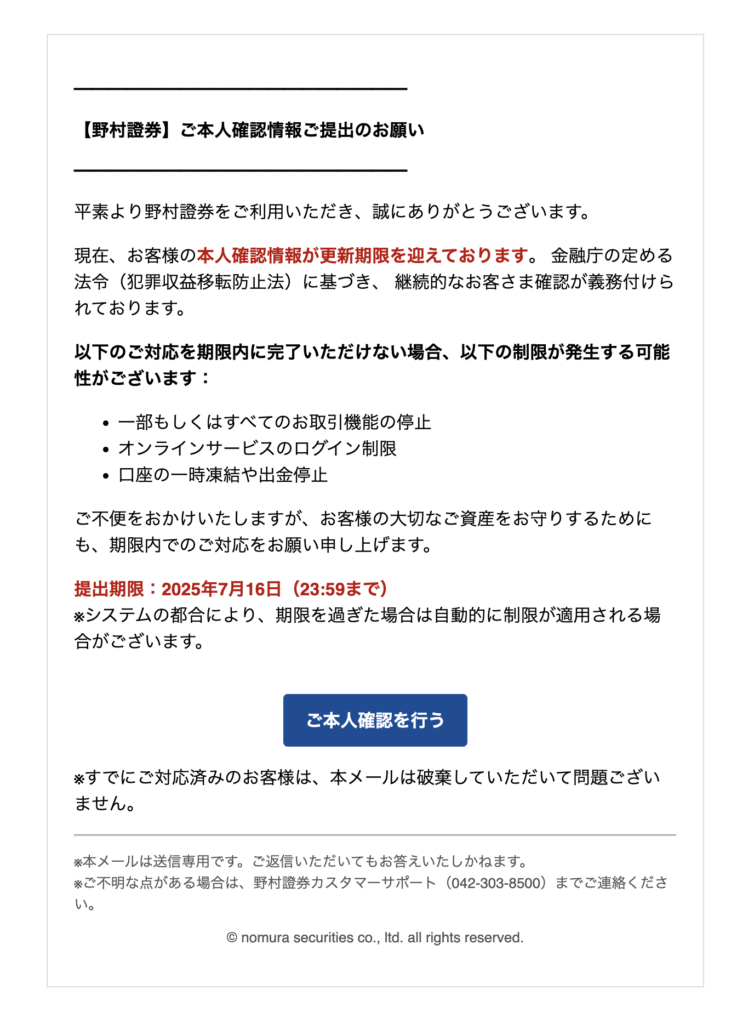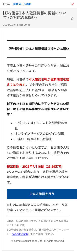 【野村證券】本人確認情報の更新について(ご対応のお願い)