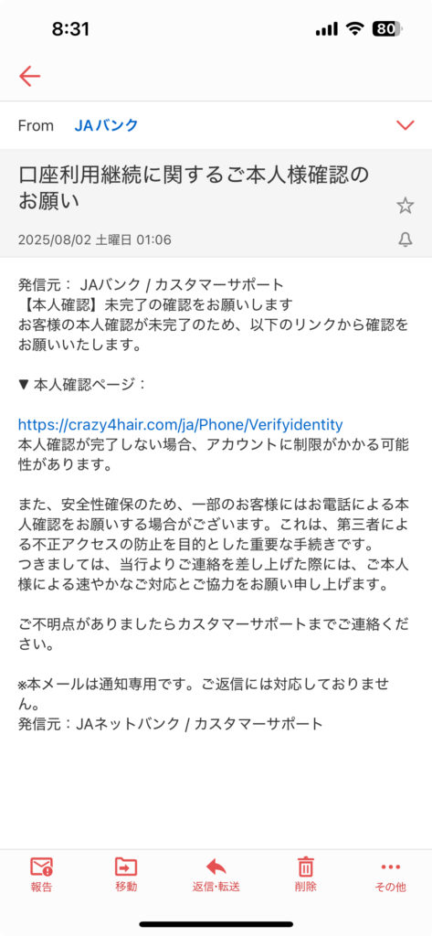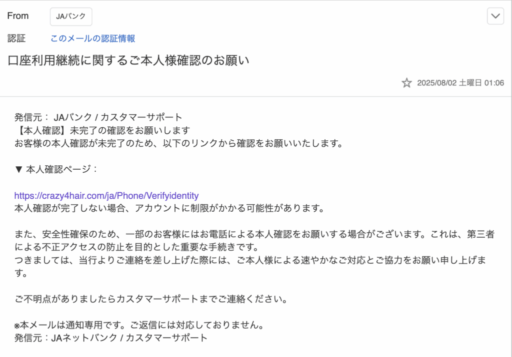 「安全性確保のため、一部のお客様にはお電話による本人確認をお願いする場合がございます。」とご丁寧に記載していますが、送信元(メールドレス)、メール本文中の「本人確認ページ」リンクURLのドメインが明らかにJAバンクではありません。