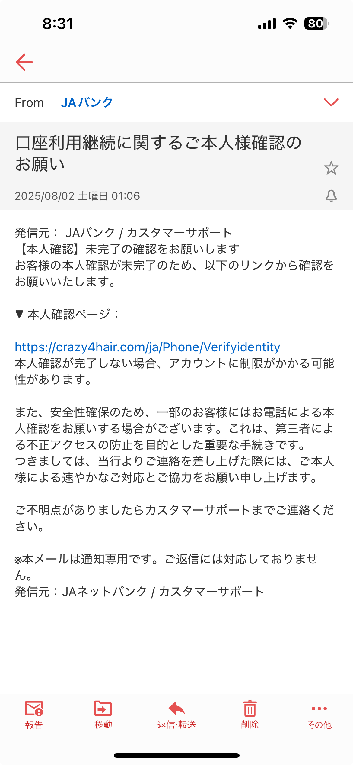 「安全性確保のため、一部のお客様にはお電話による本人確認をお願いする場合がございます。」とご丁寧に記載していますが、送信元(メールドレス)、メール本文中の「本人確認ページ」リンクURLのドメインが明らかにJAバンクではありません。
