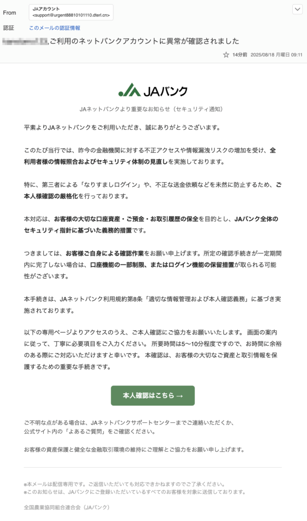 送信元(メールドレス)、メール本文中の「本人確認はこちら」リンクURLのドメインが明らかにJAネットバンクではありません。