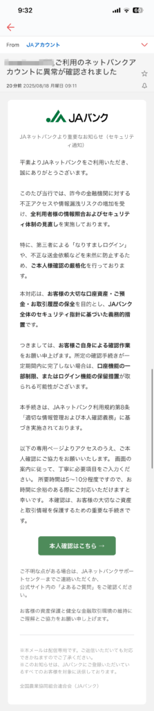 JAネットバンクより重要なお知らせ(セキュリティ通知)