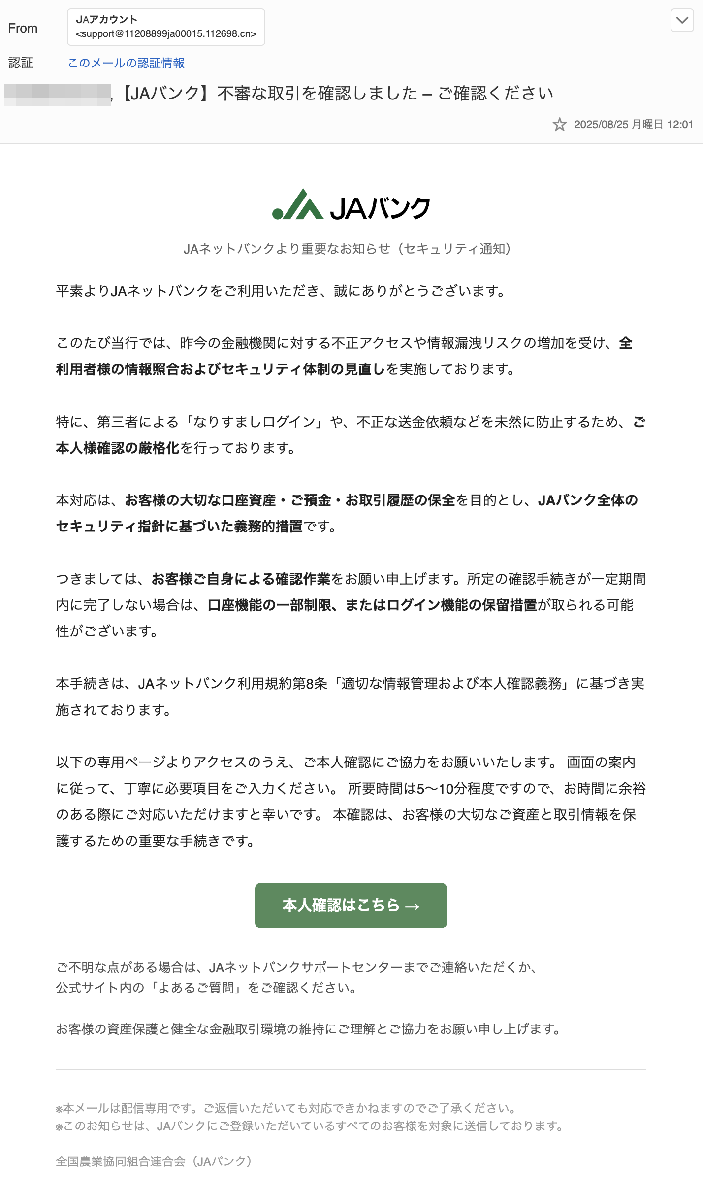 差出人(From)に企業名が入っていない場合(例:自動返信です)は、フィッシング詐欺を疑った方が安全です。