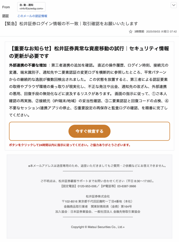 ・メール本文中の「今すぐ検査する」リンクURLが明らかに松井証券ではない。