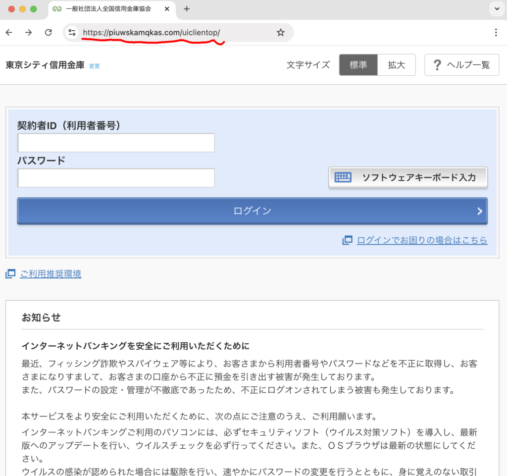 ここで契約者ID(利用者番号)とパスワードを盗まれてしまうので、絶対に入力しないでください。