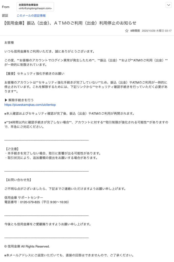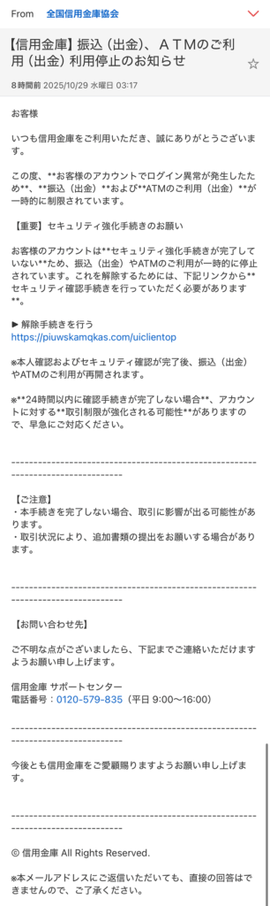 全国信用金庫協会(全国の信用金庫を会員とする業界)を装った詐欺メール(フィッシングメール)です。