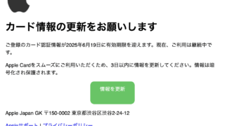 Apple カード情報の更新をお願いします この件名のメールは「Apple」を装った詐欺メール(フィッシングメール)です。URLは絶対クリックせず、すぐにゴミ箱へ捨てましょう。 2025.06.18 AppleApple Cardフィッシングメール