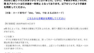 「JCBカード」になりすました詐欺メール(フィッシングメール)です。カード利用で溜まったポイントでJCB商品券に交換申込みを受け付けた旨を装っています。JCBや金額部分などが明朝体になっており、URLが文字化けしているなど詐欺メールと判断し...