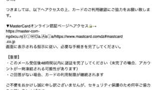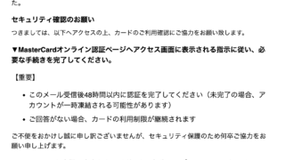 この件名のメールは「マスターカード」を装った詐欺メール(フィッシングメール)です。URLは絶対クリックせず、すぐにゴミ箱へ捨てましょう。