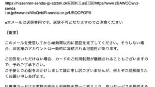 カード会社 【日専連カード】利用制限に関する連絡 このメールは「日専連カード」を装った詐欺メール(フィッシングメール)です。URLは絶対クリックせず、すぐにゴミ箱へ捨てましょう。 2025.06.12 カード会社フィッシングメール日専連