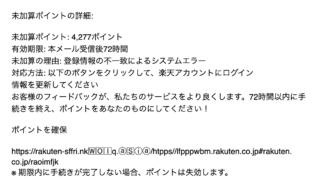 フィッシングメール 楽天ポイント未加算分の期限迫る(残り3日) このメールは「楽天株式会社」を装った詐欺メール(フィッシングメール)です。URLは絶対クリックせず、すぐにゴミ箱へ捨てましょう。 2025.06.12 フィッシングメール楽天楽天ポイント