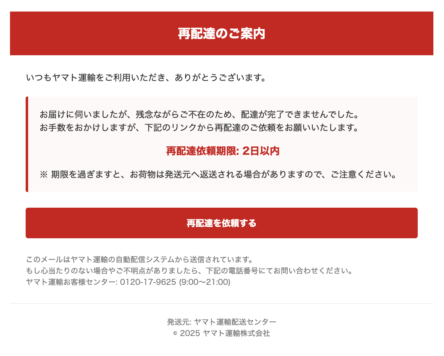 フィッシングメール 【緊急】再配達手続きのご依頼 「ヤマト運輸」になりすました詐欺メール(フィッシングメール)です。荷物の再配達依頼を促す旨を装っています。送信元(メールドレス)、メール本文中のリンクURLのドメインが明らかにヤマト運輸ではありません。件名を少し変えた同じような迷惑メールが... 2025.07.16 フィッシングメールヤマト運輸運送会社