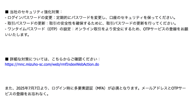 フィッシングメール 【みずほ証券】不正取引対策と口座の安全性強化について 「みずほ証券」になりすました詐欺メール(フィッシングメール)です。フィッシング詐欺による不正アクセスが多発しているため、ログインパスワードの変更、取引パスワードの更新、ワンタイムパスワードの登録を促す旨を装っています。みずほ証券のドメインは... 2025.07.07 みずほ証券フィッシングメール証券会社