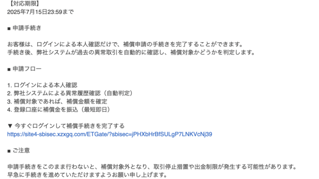 「SBI証券」になりすました詐欺メール(フィッシングメール)です。SBI証券口座において、米国株式の配当金入金が確認された旨を装っています。米国株式を所有している方はドキッとするかもしれませんが、明らかな詐欺メールなのでご注意ください。・ロ...