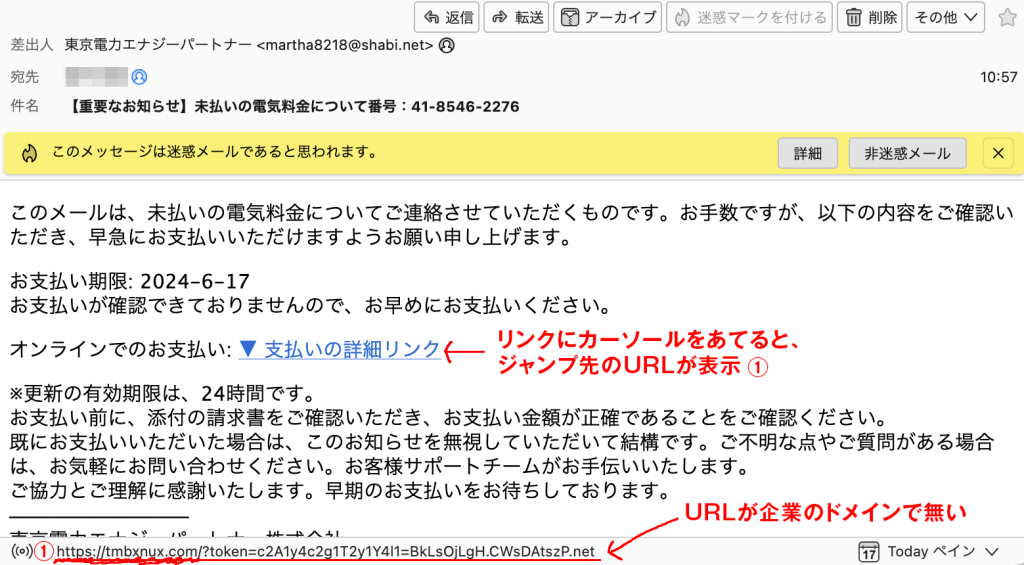 粗雑なフィッシング詐欺であれば、ここを確認すれば、大抵は本物か偽物が判別することが出来ます。